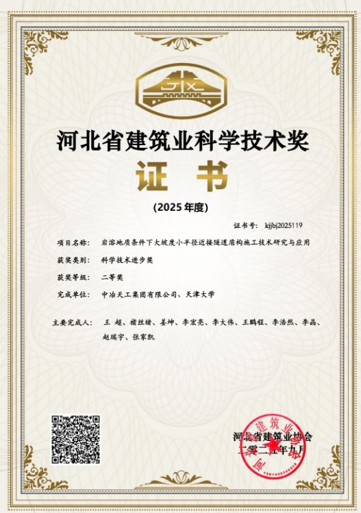 近日,由華南公司牽頭,聯(lián)合天津大學(xué)共同完成的“巖溶地質(zhì)條件下大坡度小半徑近接隧道盾構(gòu)施工技術(shù)研究與應(yīng)用”項目,榮獲河北省建筑業(yè)協(xié)會2025年度科學(xué)技術(shù)進步獎二等獎。此項殊榮,標志著華南公司在復(fù)雜地質(zhì)隧道施工技術(shù)領(lǐng)域取得了重大突破。
